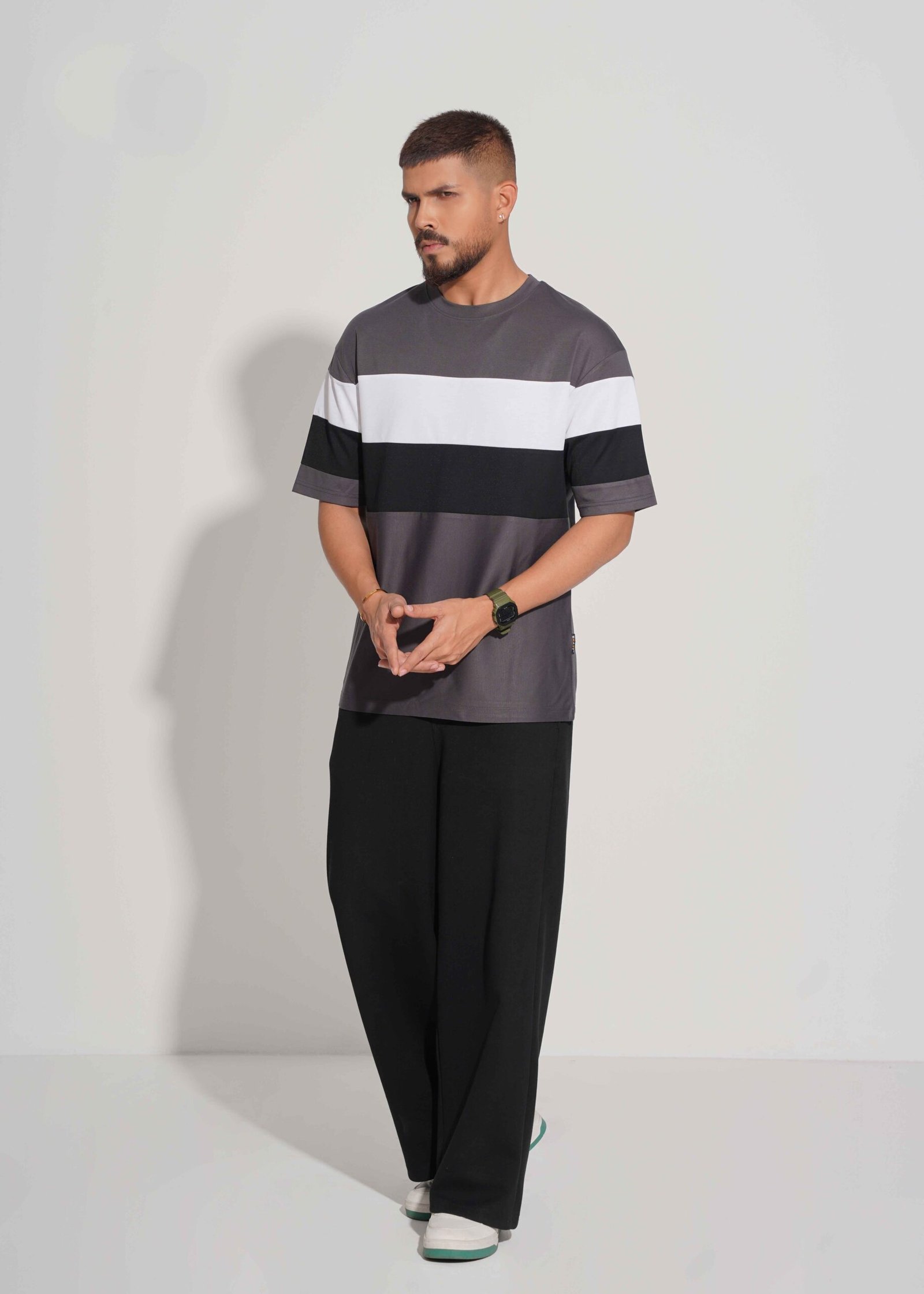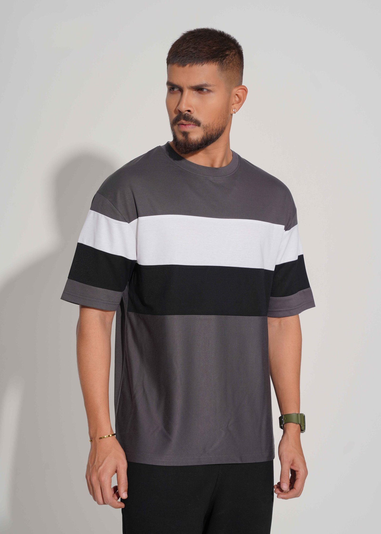 The stylish grey, white, and black color block design gives a clean and trendy appearance, perfect for daily wear, casual outings, and weekend use. With a regular modern fit and half sleeves, this men’s t-shirt ensures both comfort and style.